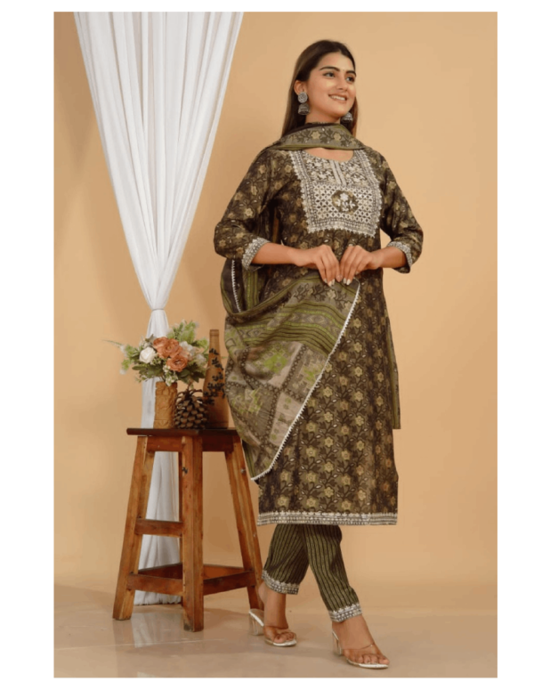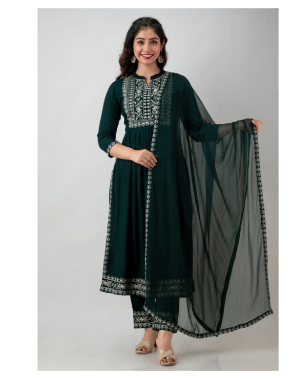 Women Dark Green Embroidered Straight Kurta & Pant With Duptta