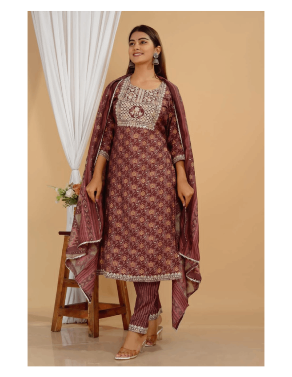 Women Brown Embroidered Straight Kurta & Pant With Duptta