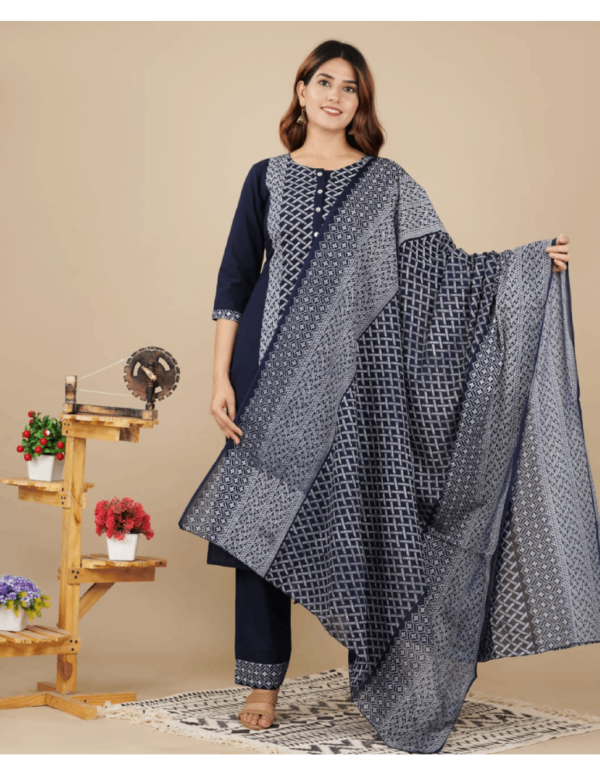 Women Navy Blue Embroidered Straight Kurta & Pant With Duptta
