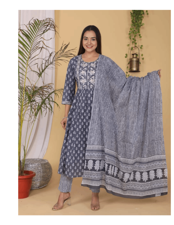 Women Grey Embroidered Straight Kurta & Pant With Duptta