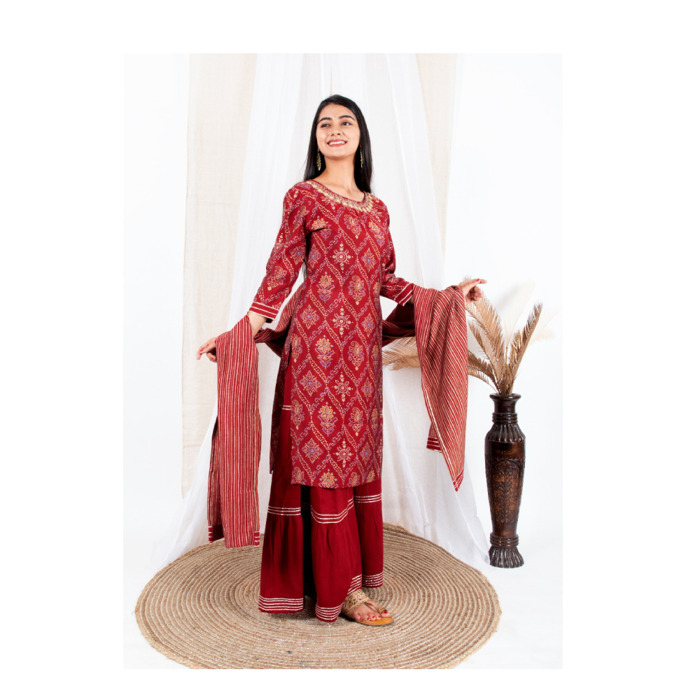 Chanderi Cherry Maroon Kurta Sharara With Dupatta