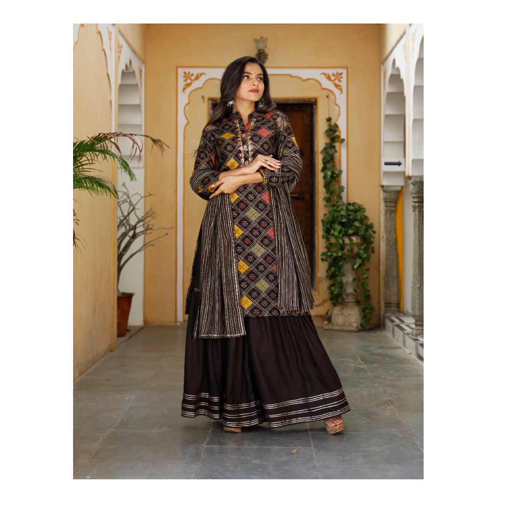 Chanderi Chocolate Brown Kurta Sharara With Dupatta
