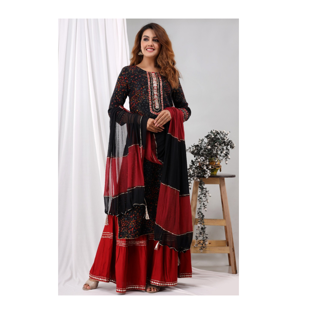 - Dupatta Colour – Combination Of Ivory Black And Current Red