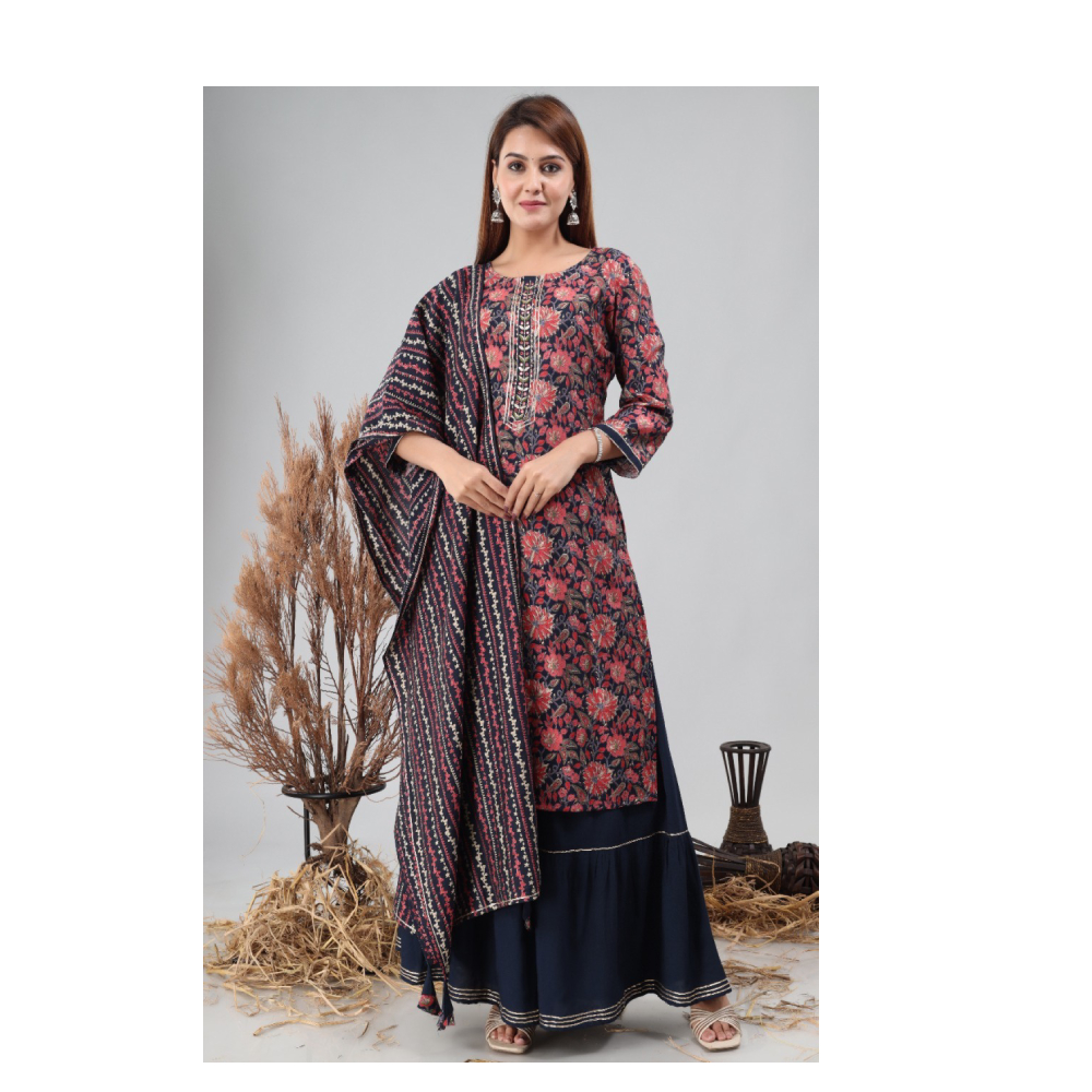 Denim Blue With Rose Wood Pink Kurta Sharara With Dupatta