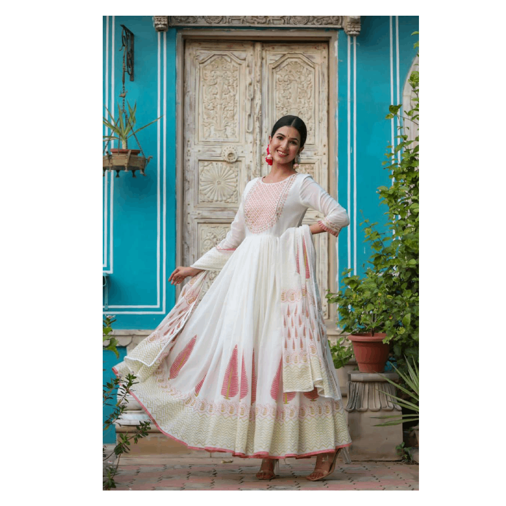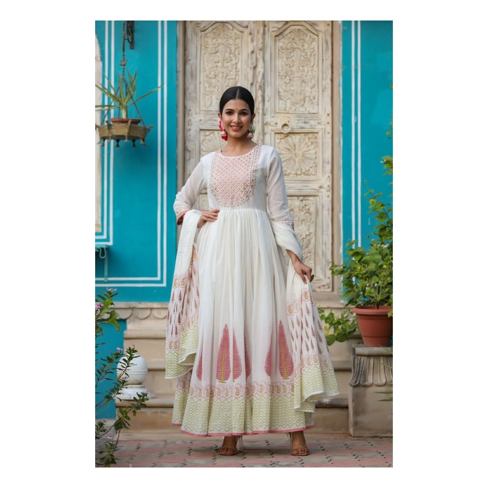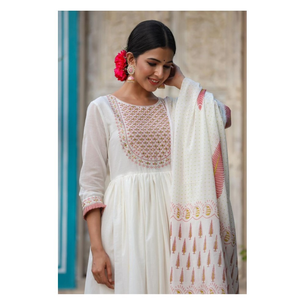 Kurta Dupatta Set (White Green Hand Block Printed)