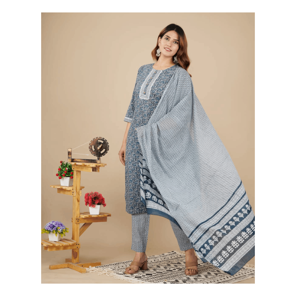 Women Green Embroidered Straight Kurta & Pant With Duptta