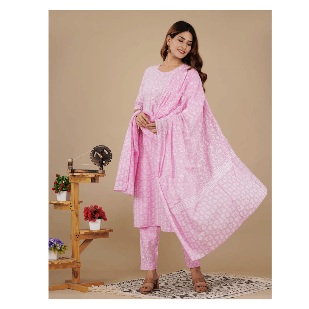 Women Pink Embroidered Straight Kurta & Pant With Duptta