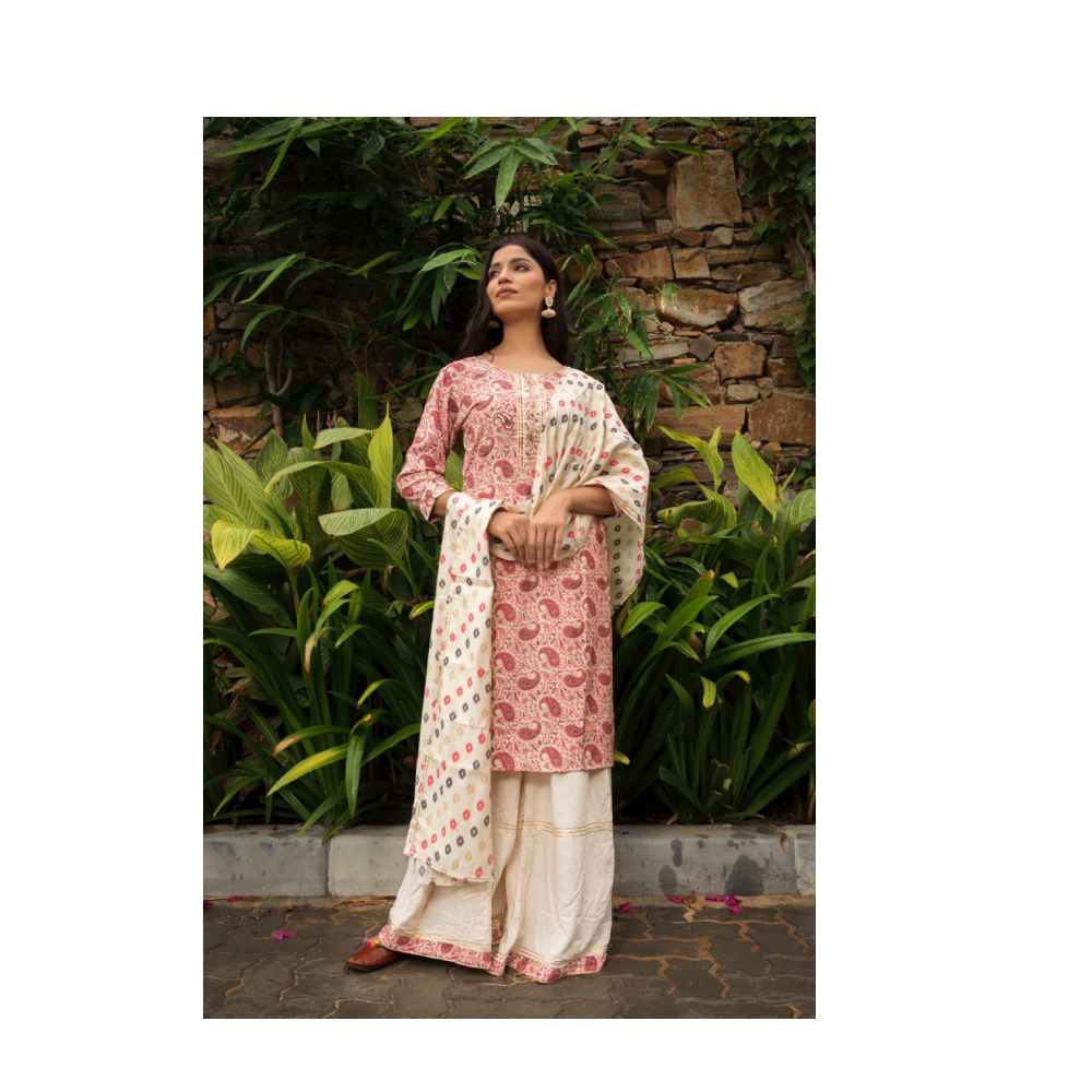 Pink And Cream Color Kurti Sharara Set With Dupatta