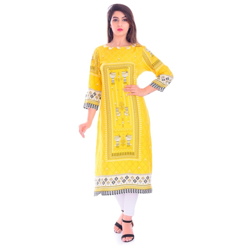 Women Solid Cotton Blend Straight Kurta (Yellow)