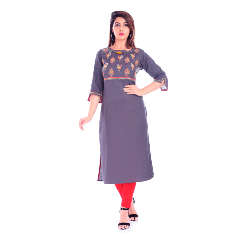Women Embroidered Cotton Blend Straight Kurta (Grey)