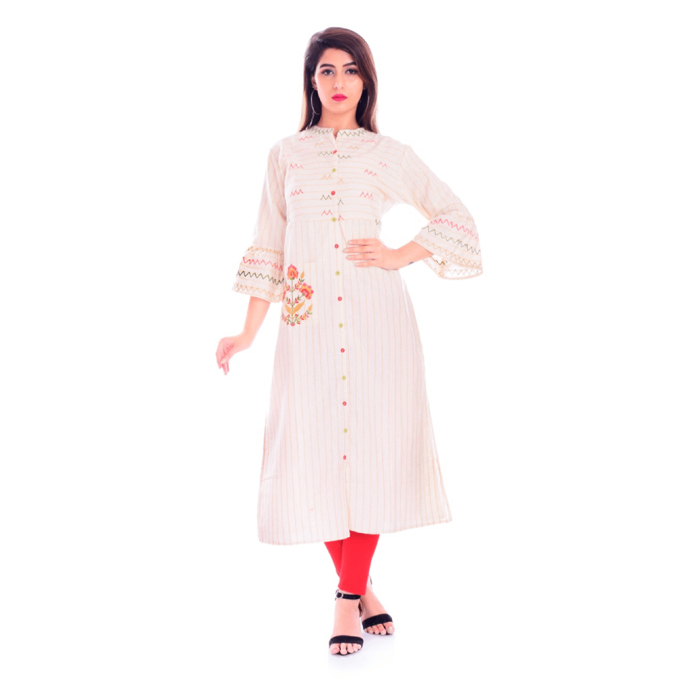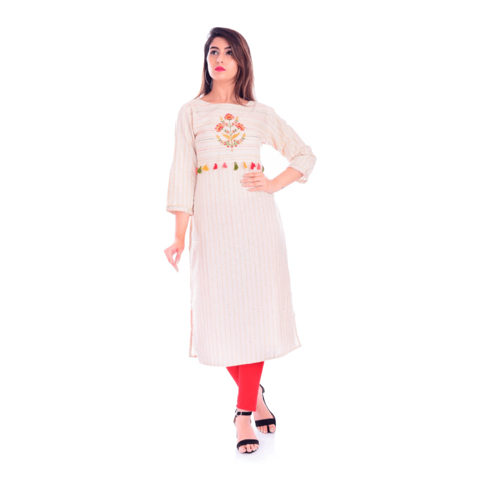 Women Embroidered Cotton Blend Straight Kurta (Off-White)