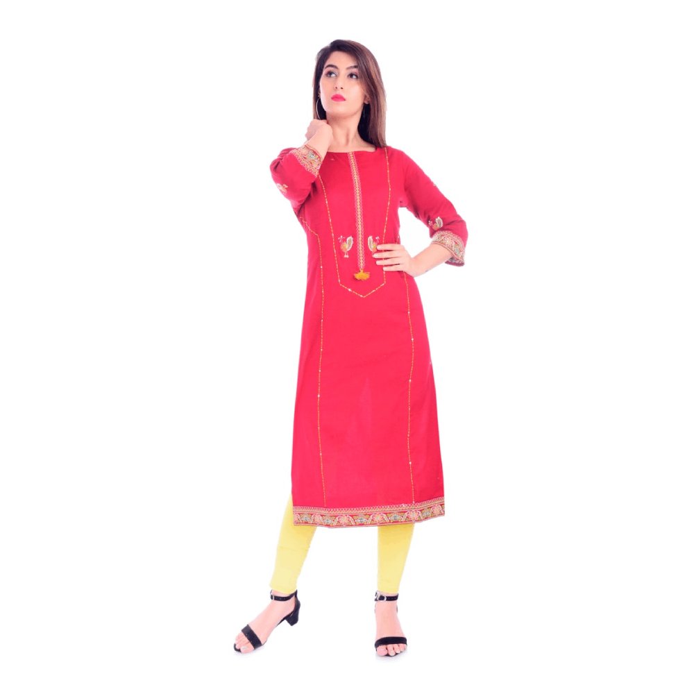Women Embroidered Cotton Blend Straight Kurta (Pink)