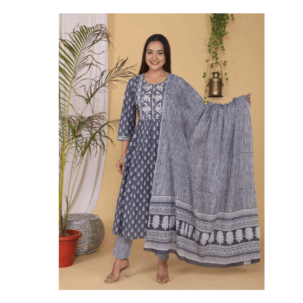 Women Grey Embroidered Straight Kurta & Pant With Duptta