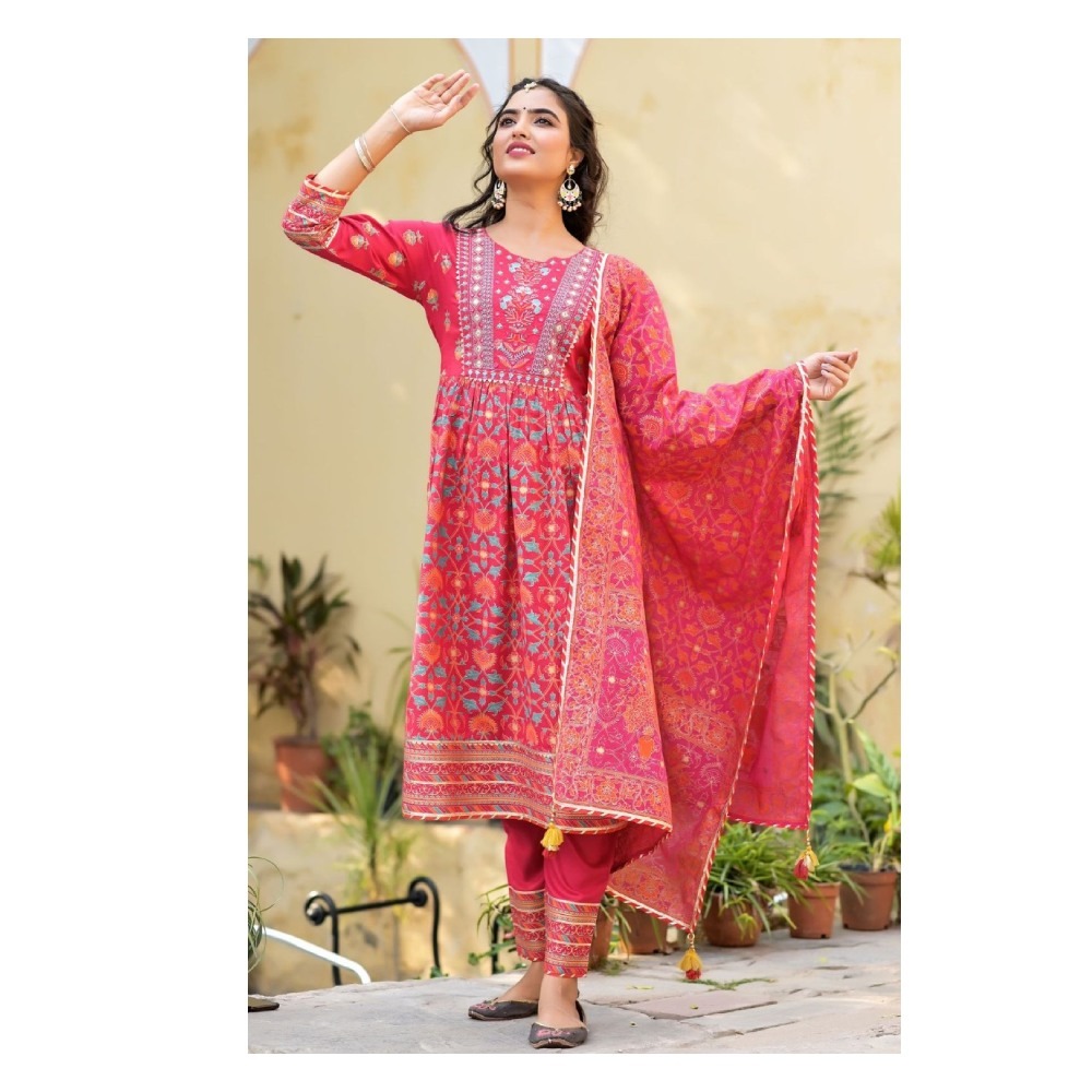 Women Pink Embroidered Straight Kurta & Pant With Duptta