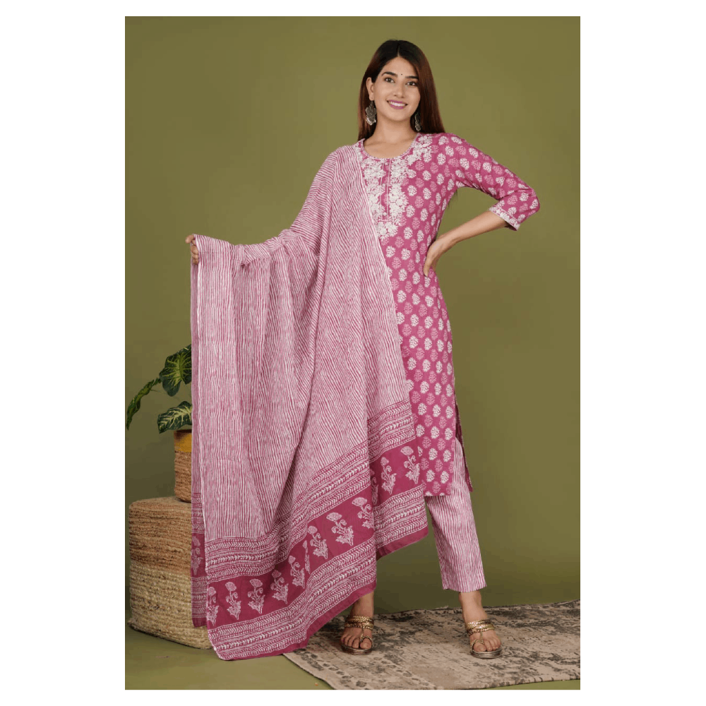 Women Purple Embroidered Straight Kurta & Pant With Duptta