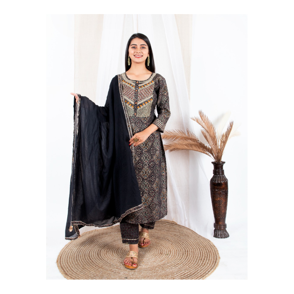 Women White Embroidered Straight Kurta & Pant With Duptta (Black)